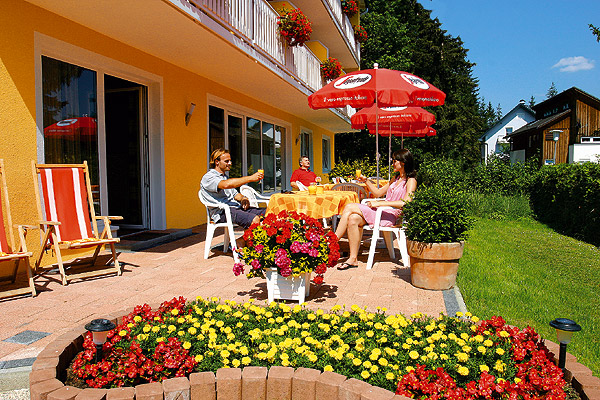 Sonnenterrasse, Liegewiese und Kinderspielplatz alles vor Ort in einer schönen und gemütlichen Pension.